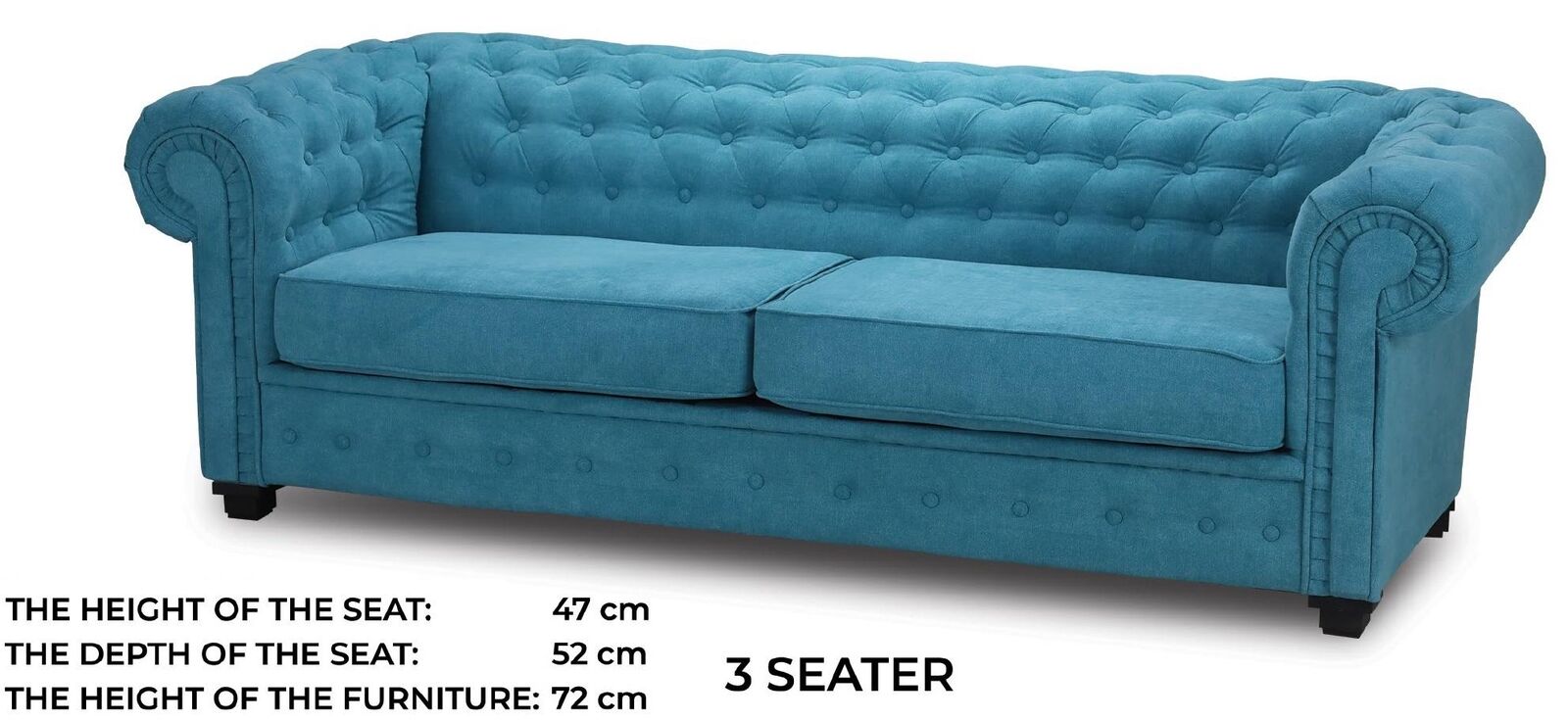 Inricht je woonruimte met deze stijlvolle Driepersoonsbank van textiel in Turkoois. Met afmetingen van ca. 224 x 90 x 72 cm biedt deze sofa voldoende ruimte en comfort voor drie personen. De bank is beschikbaar in diverse kleuren en materialen, waaronder stof of premium kunstleder. Het stevige binnenwerk van echt hout zorgt voor duurzaamheid en stabiliteit, terwijl de zithoogte van ca. 47 cm en zitdiepte van ca. 52 cm bijdragen aan een prettige zitervaring.