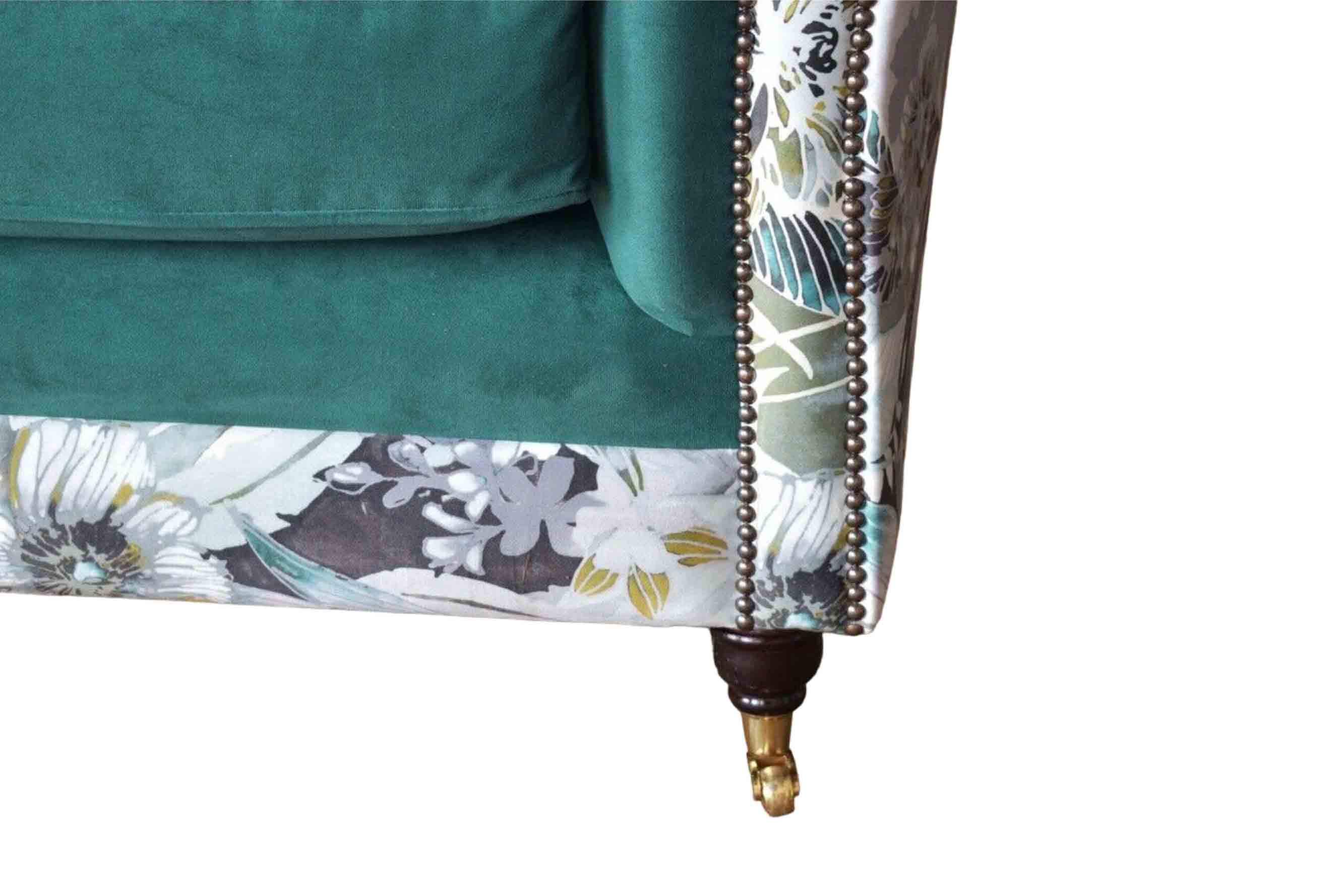 Een levendige driezitsbank van Chesterfield in een delicate smaragdkleur met bloemmotief.