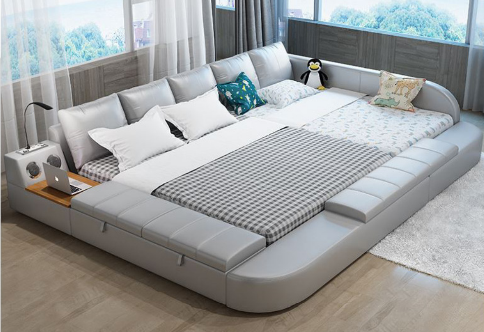 Dankzij de verstelbare tafel en optionele LED ondergrondverlichting kunt u de sfeer aanpassen naar uw wensen en behoeften. Of u nu wilt ontspannen met een goed boek, naar muziek wilt luisteren via Bluetooth, of uw telefoon wilt opladen, dit bed biedt het allemaal. Kies uit verschillende bekledingsopties, van premium kunstleer tot echt Italiaans rundleer, en geef uw slaapkamer een persoonlijke touch. Met de **Multifunctioneel bankbed XXL** creëert u een luxueuze en multifunctionele slaap- en leefruimte in één, waar comfort en modern gemak samenkomen op een unieke manier.
