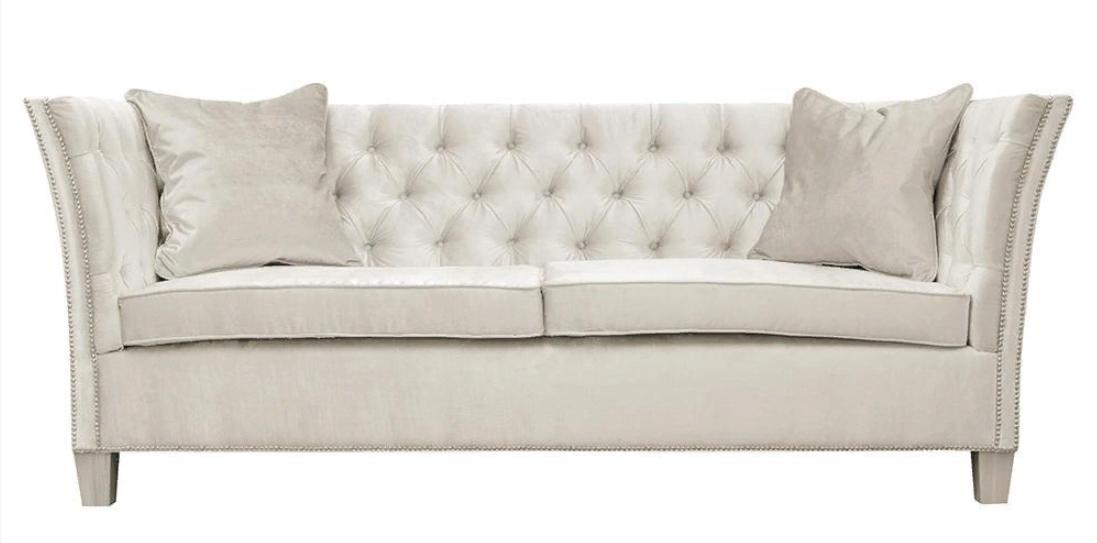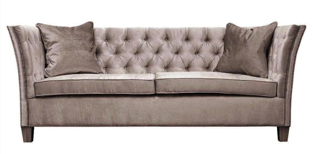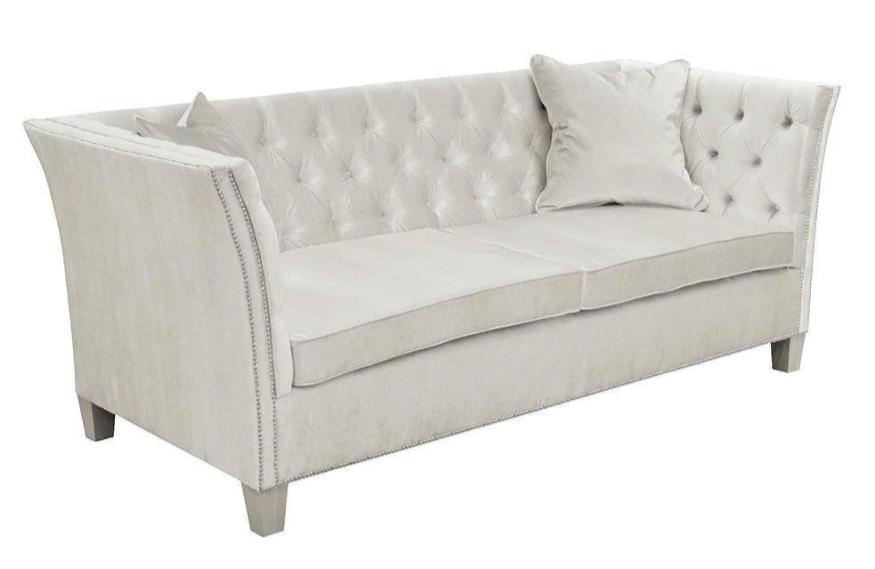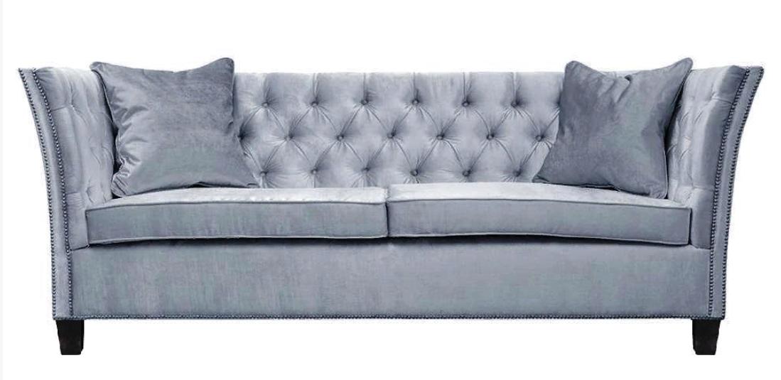 Chesterfield tweezits lichtgrijze stoffen woonkamer designbank creatief.