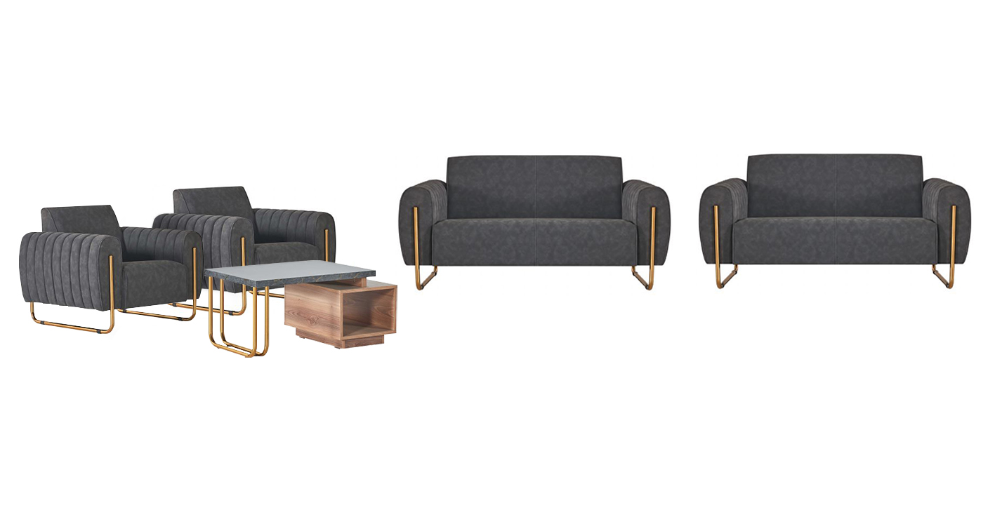 De **Edle grijze kantoorset** bestaat uit twee gestoffeerde tweezitters, twee fauteuils en een elegante salontafel. Deze meubelset combineert een **subtiele grijstint** met luxueuze **gouden poten**, wat een moderne uitstraling geeft aan elke kantooromgeving. De tweezitters hebben een comfortabele zitdiepte van 56 cm en een zithoogte van 44 cm, waardoor ze ideaal zijn voor ontspannen vergaderingen of informele besprekingen. De salontafel is vervaardigd uit hoogwaardig **hout** met een opvallend **gouden onderstel**, aangevuld met een functionele plank voor extra opbergruimte. Dit hoogwaardige ontwerp maakt deze meubelset tot een veelzijdige keuze voor **eigentijdse kantoorinterieurs**.