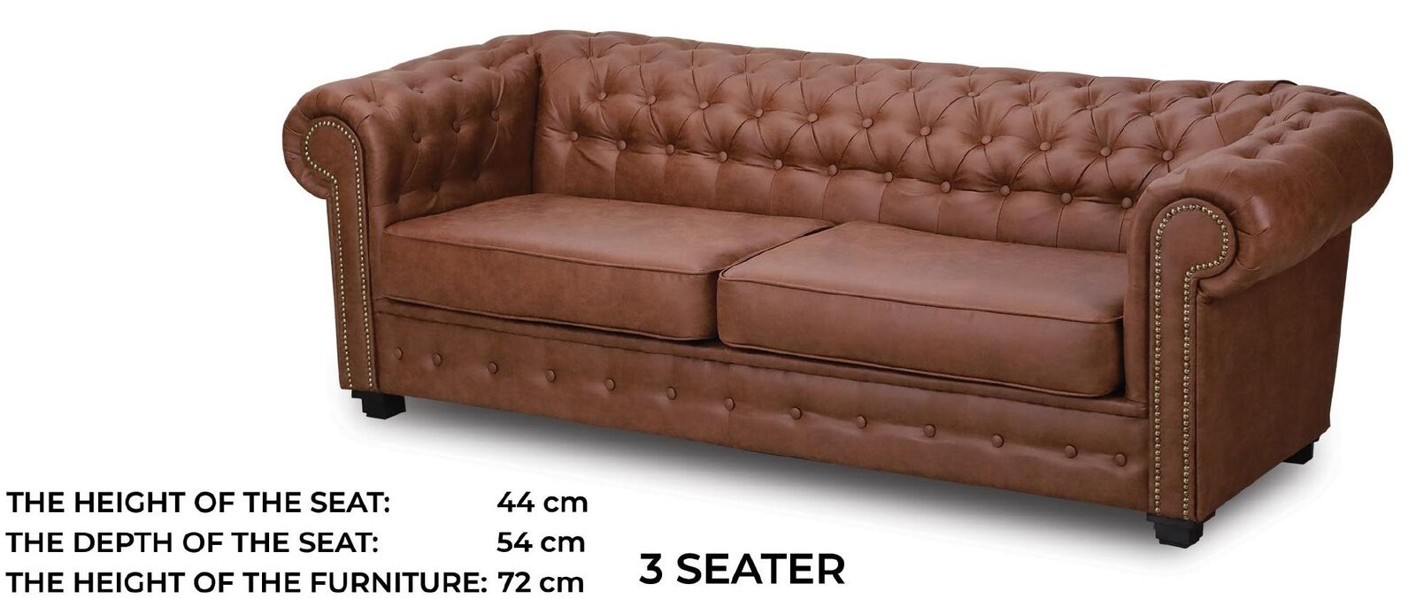 Inrichten was nog nooit zo eenvoudig met de Sofa Chesterfield 3+2+1 Woonkamerset. Dankzij de afmetingen van ca. 224 x 90 x 72 cm voor de 3-zitsbank, 194 x 90 x 72 cm voor de 2-zitsbank en de 1-zitsbank, past deze set perfect in elke woonkamer. Of je nu ontspant na een lange dag werken of gasten ontvangt voor een gezellige avond, deze banken bieden het comfort en de stijl die je zoekt. Ga voor luxe en kwaliteit met deze prachtige bankstel set!