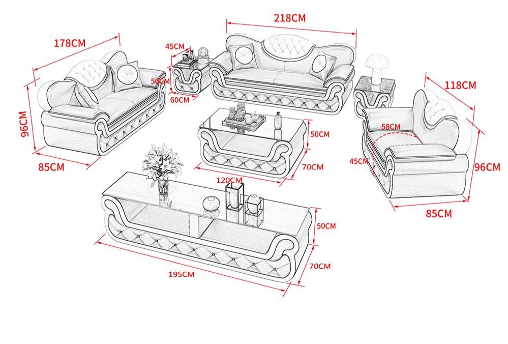 Aanvullende details: De bankstellen zijn verkrijgbaar in verschillende kleuren naar keuze, waardoor je de mogelijkheid hebt om de set aan te passen aan je persoonlijke voorkeur en interieurstijl. Het gebruik van premium ledervezelstof zorgt voor een luxueuze uitstraling en gemakkelijk onderhoud. Het binnenframe van echt hout en de veerkern zorgen voor langdurig comfort en ondersteuning. Of je nu geniet van een ontspannen avond voor de tv of gasten ontvangt, deze 7-delige woonkamerset biedt een luxueuze en comfortabele zitervaring voor alledaags gebruik.