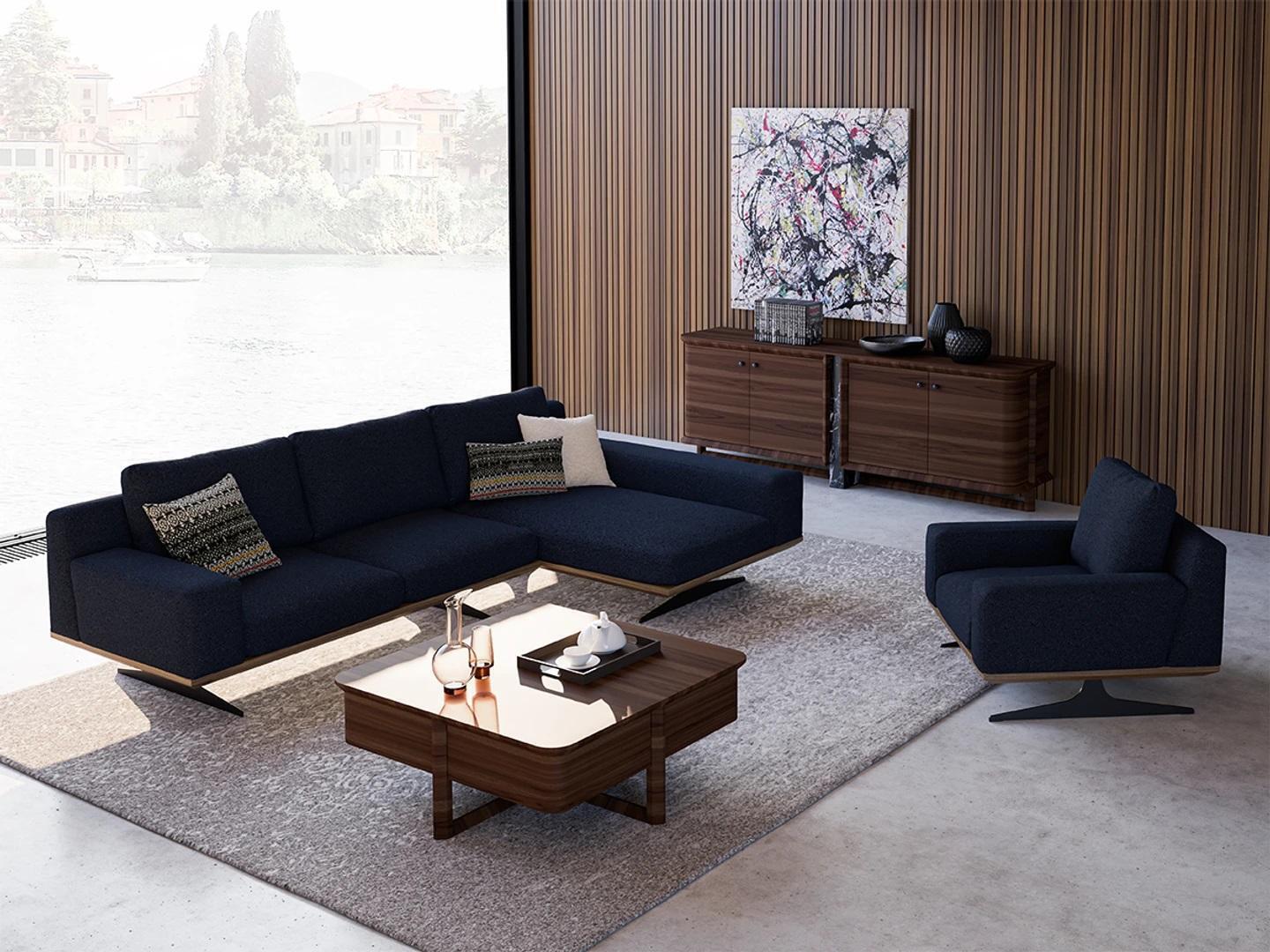 Met onze Moderne Blau Designer Woonkamer Inrichting Gestoffeerde Bank haal je een stijlvolle toevoeging aan je huis. Deze luxueuze hoekbank en fauteuil combineren comfort en elegantie, waardoor ze perfect zijn voor elk modern interieur. De L-vormige hoekbank meet ongeveer 298 x 170 cm, terwijl de fauteuil een afmeting heeft van ca. 100 x 95 x 88 cm. Gemaakt van hoogwaardig hout en bekleed met zacht textiel in een prachtige blauwe kleur, is deze woonkamerinrichting een blikvanger in elke ruimte. De ruime zitting en diepte zorgen voor optimaal comfort, terwijl de strakke lijnen en trendy design een eigentijdse uitstraling geven aan je huis.