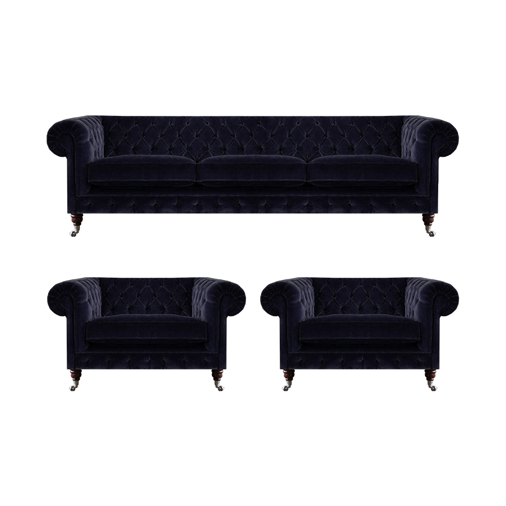 Blauwe Chesterfield bankstel designer 3-zitter 2x fauteuils 3-delig.