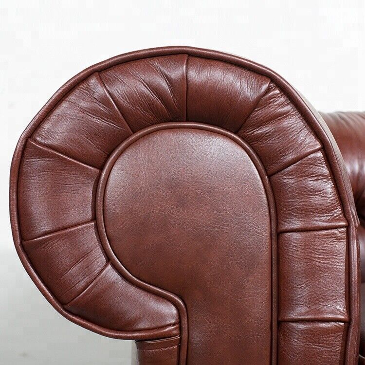 Klassieke bruine leren Chesterfield bankstel met gestoffeerde zitting 3-zits.
