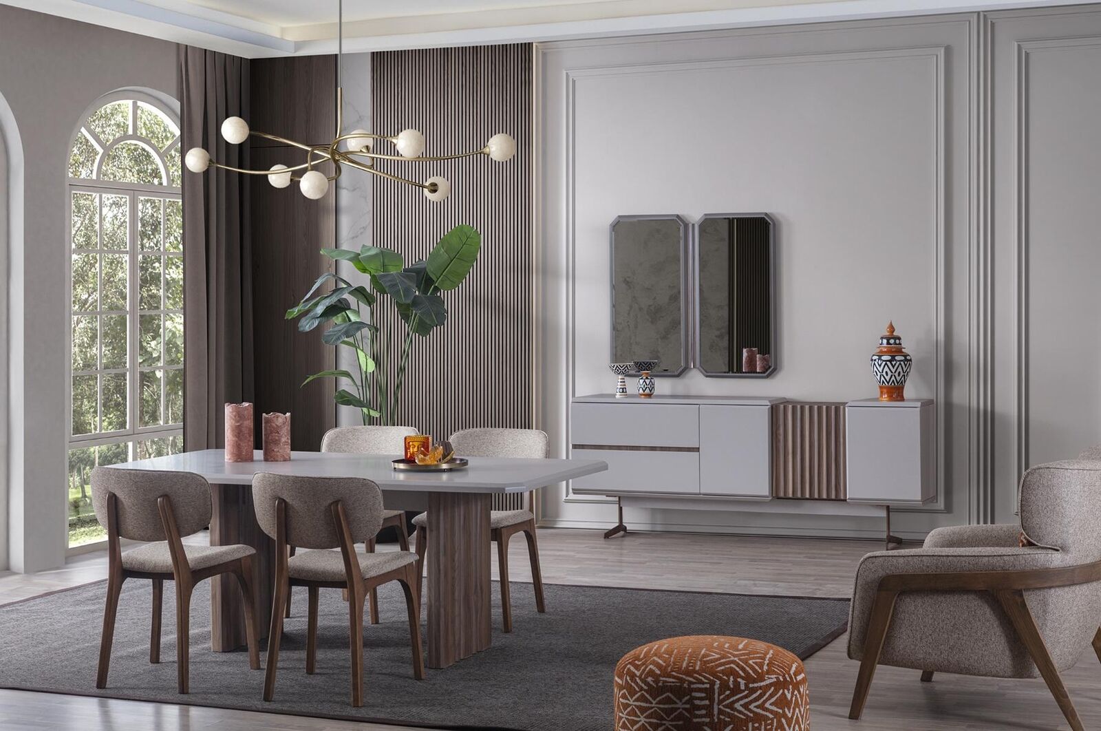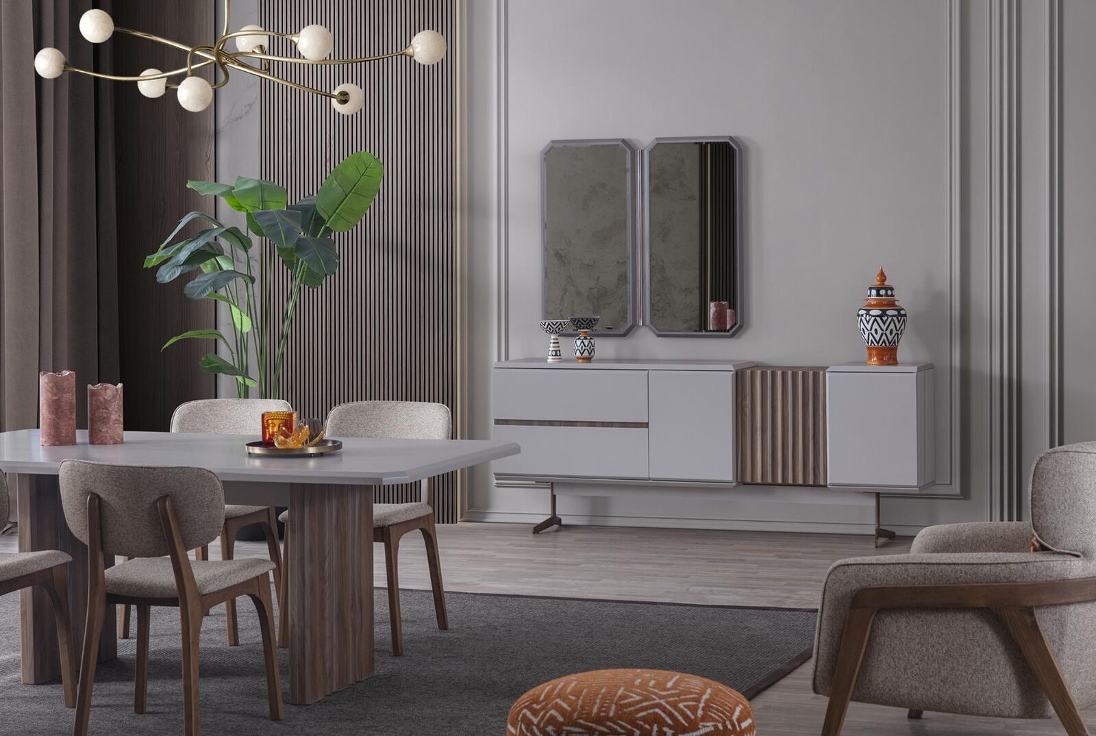 Inrichten van uw eetkamer was nog nooit zo eenvoudig met deze 8-delige eetkamerset. Deze set is perfect voor gezellige familiemaaltijden of dinerfeestjes met vrienden. De neutrale kleurstelling past moeiteloos in elke interieurstijl en kan worden gecombineerd met diverse decoratie. De ruime afmetingen van de eettafel bieden voldoende plaats voor uw gasten, terwijl het dressoir voldoende opbergruimte biedt voor servies en andere benodigdheden. Met deze eetgroep geniet u niet alleen van comfortabele en stijlvolle diners, maar creëert u ook een sfeervolle ambiance in uw eetkamer.