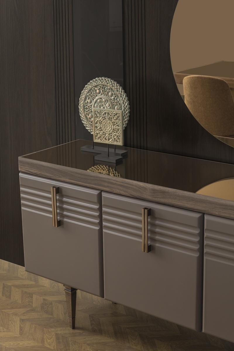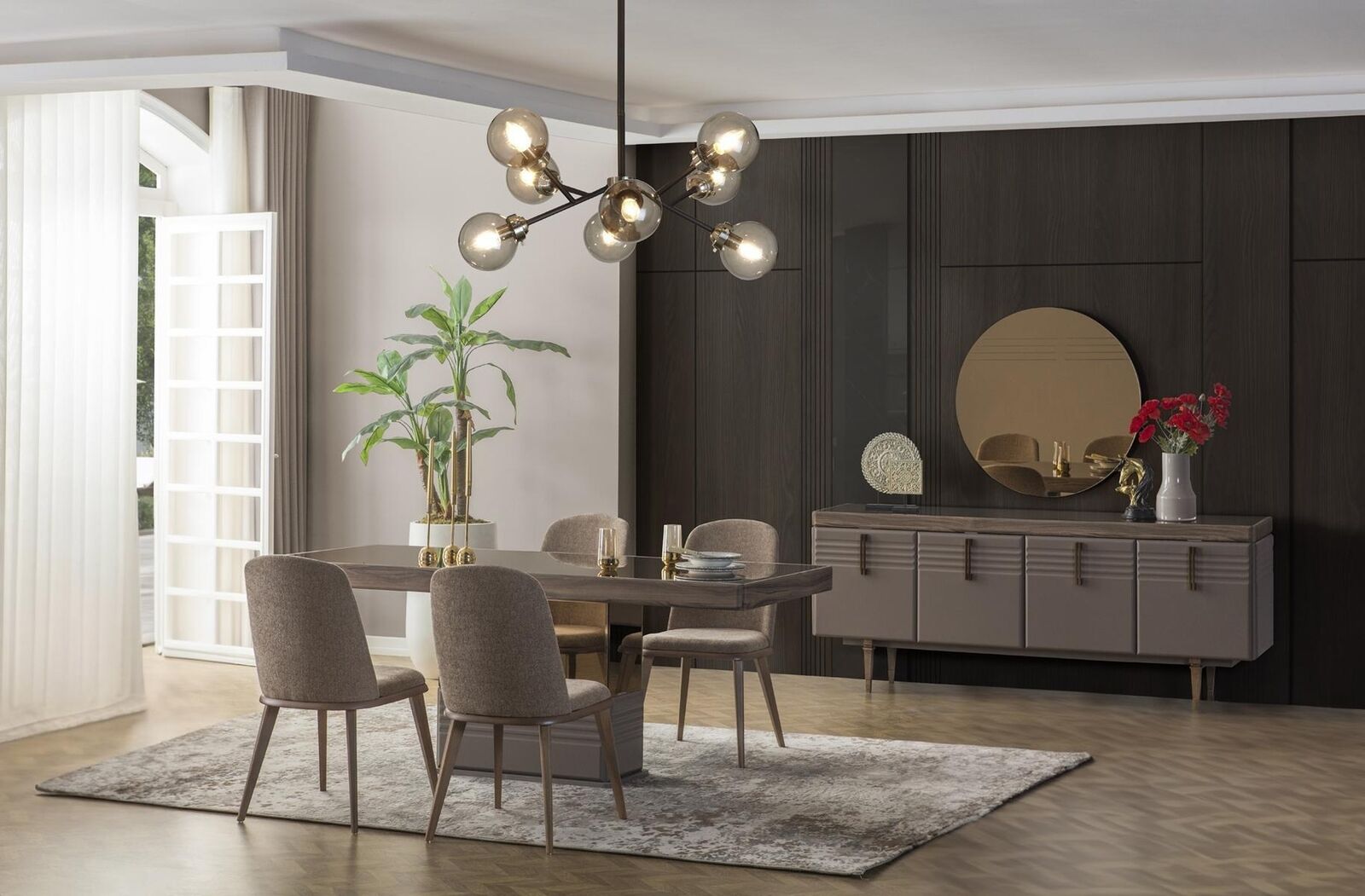 Deze set is ideaal voor zowel dagelijks gebruik als voor het ontvangen van gasten bij speciale gelegenheden. De ruime eettafel biedt volop plek voor gezellige etentjes en familiebijeenkomsten. De comfortabele stoelen nodigen uit om lang na te tafelen, terwijl het dressoir en de spiegel een chique toevoeging zijn aan de ruimte. Of je nu een formeel diner organiseert of gewoon geniet van een ontspannen ontbijt, deze moderne eetkamerset biedt alles wat je nodig hebt voor een sfeervolle eetkamerervaring.