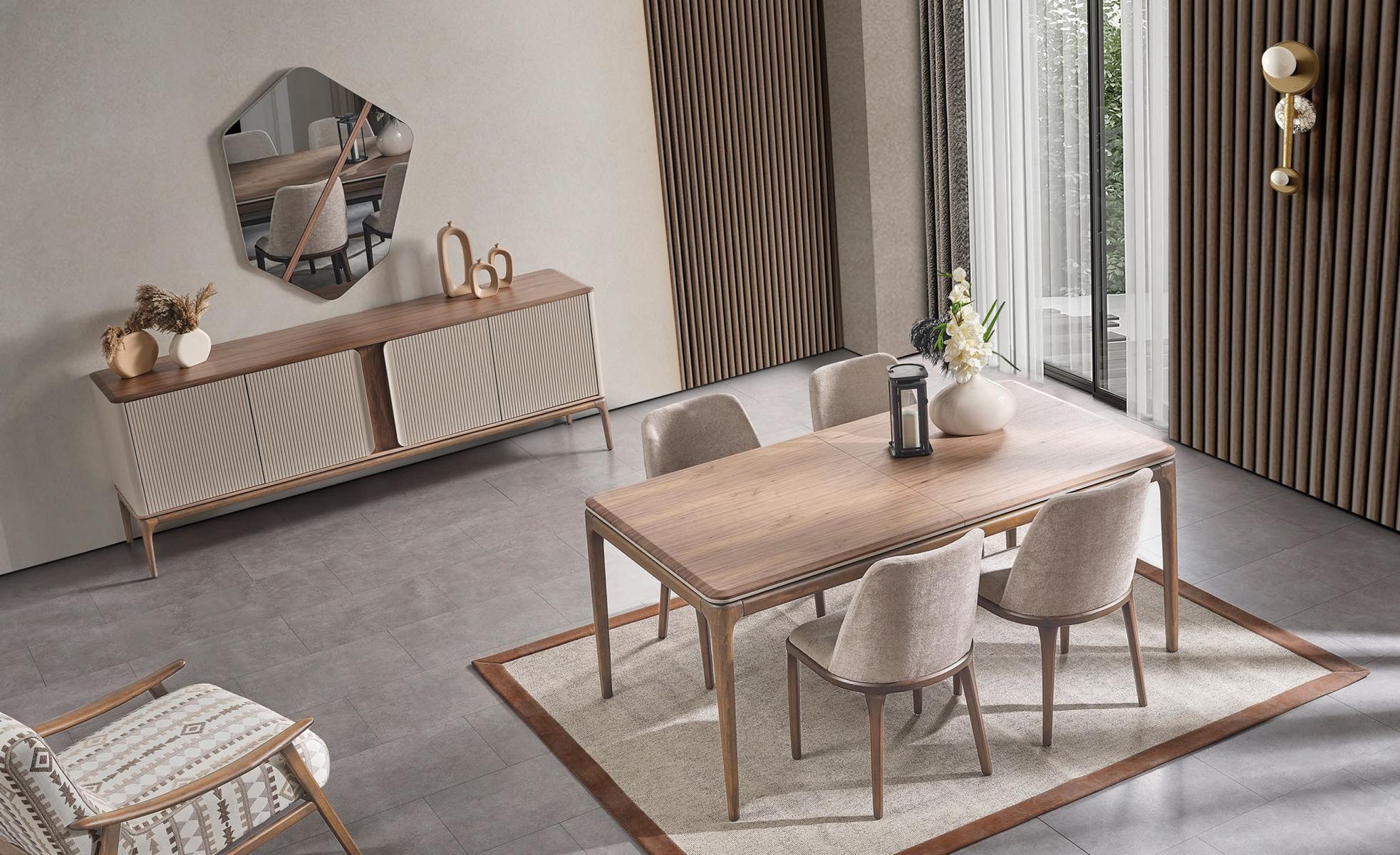 Eettafel, stoelen, dressoir, spiegel, set, modern design, kopen, betaalbaar, kwaliteitsmeubilair.