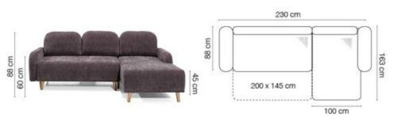 De comfortabele hoekbank combineert modern en functioneel ontwerp voor een stijlvolle toevoeging aan uw interieur. Met een ruime afmeting van 230 x 163 cm biedt deze L-vormige hoekbank voldoende zitruimte en comfort. De bank is 88 cm hoog, 88 cm diep en heeft een zitdiepte van 60 cm, waardoor het perfect is voor ontspanning na een lange dag. Het slaapoppervlak van 200 x 145 cm maakt het ook ideaal voor gasten die blijven overnachten. Het binnenframe van natuurlijk hout zorgt voor stevigheid en duurzaamheid.