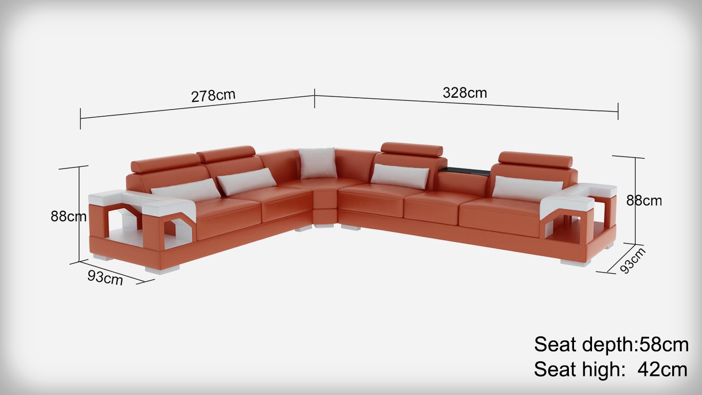 Lerensofa Bank Bank Zitbank Bekleding Woonlandschap Designer Leren Bank L Vorm Set biedt een luxe en stijlvolle toevoeging aan uw woonruimte. Met zijn elegante L-vorm en ruime afmetingen van ca. 278 x 328 cm of ca. 328 x 278 cm, is dit hoekbankstel perfect om te ontspannen of te socializen met familie en vrienden. De bank heeft een comfortabele hoogte van ca. 88 cm en een zachte zitdiepte van ca. 58 cm, waardoor het een uitnodigende plek is om te vertoeven. Bovendien is deze bank voorzien van 3 geïntegreerde USB-poorten, waardoor opladen en gebruiken van elektronische apparaten eenvoudig en handig wordt.