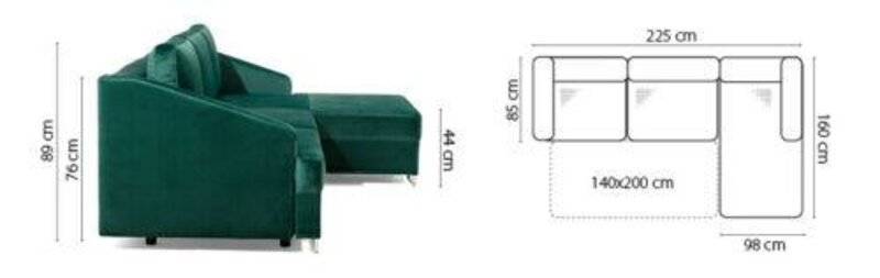 De Luxe hoekbank bank met Smaragd groene bank bekleding en hoekbank bedfunctie is een prachtige toevoeging aan elk interieur. Met een ruime afmeting van 225 x 160 cm biedt deze hoekbank voldoende zitruimte voor gezellige avonden met vrienden en familie. Dankzij de hoogwaardige materialen, waaronder Stof of kunstleer - Groep 0, is deze hoekbank niet alleen stijlvol maar ook duurzaam. Het binnenframe van natuurlijk hout zorgt voor stevigheid en stabiliteit, terwijl de zitdiepte van 60 cm en slaapplaats van 200 x 145 cm zorgen voor ultiem comfort en veelzijdigheid.