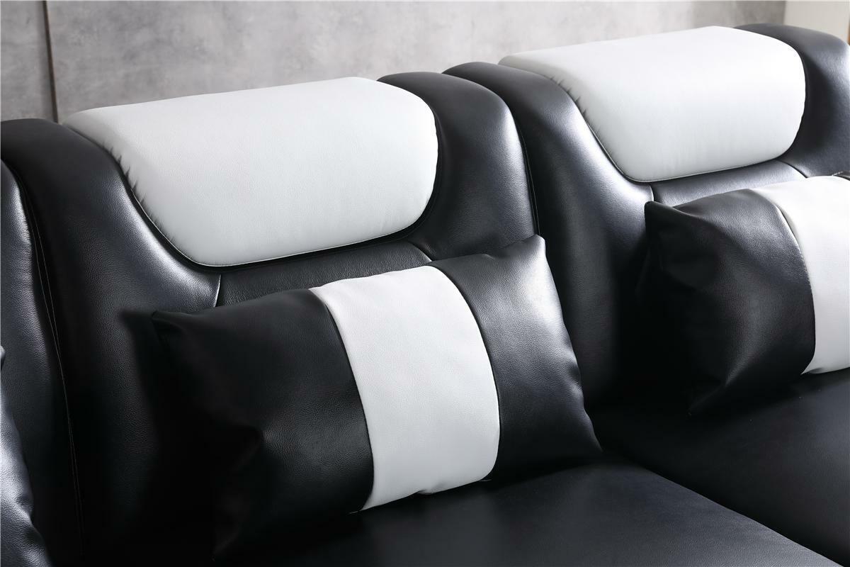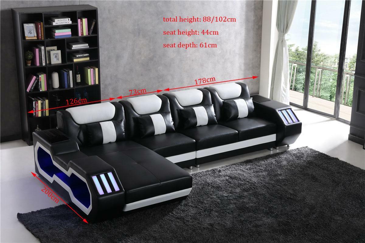 Ontspannen L-vormige bank in de vorm van een bankstel met verlichte woonkamer is een luxueuze toevoeging aan uw interieur. Met een afmeting van ca. 200 x 377 cm of 377 x 200 cm, biedt deze hoekbank in L-vorm voldoende ruimte om te ontspannen en te genieten van uw woonkamer. De bank is vervaardigd uit hoogwaardige materialen, met premium ledervezelstof (70% leder / 30% polyester) die zorgen voor duurzaamheid en comfort. De optionele upgrades naar premium echt leder of textielstof geven u de vrijheid om de bank aan te passen aan uw persoonlijke stijl en voorkeuren. Het verende systeem en het binnenframe van echt hout zorgen voor een stevige en comfortabele zitervaring.