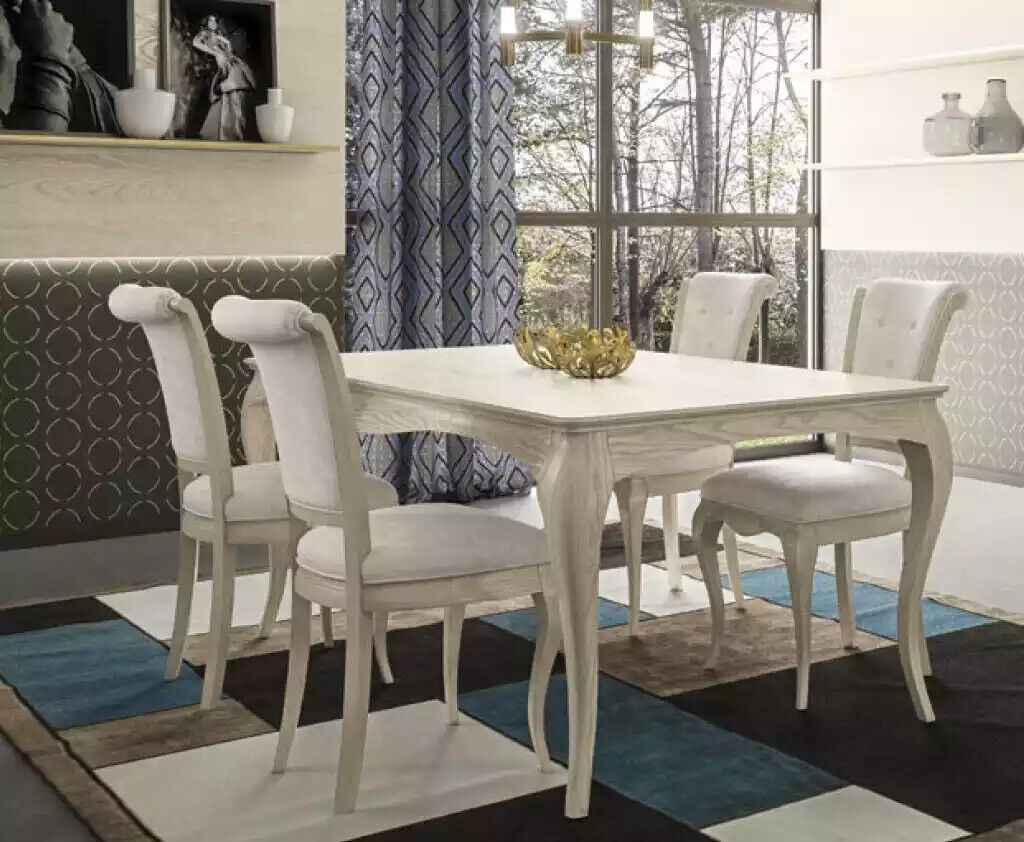 Eetkamer set Wit Eettafel 4x Stoelen Dressoir Elegant Design Nieuw 6-delig. Creëer een elegante eetkamer met deze prachtige 6-delige set. De set bestaat uit een witte eettafel die varieert in grootte van 110 x 110 x 78 cm tot 160 x 110 x 78 cm wanneer uitgetrokken, 4 comfortabele stoelen van 52 x 50 x 100 cm en een stijlvol dressoir van 190 x 53 x 94 cm. Vervaardigd uit hoogwaardig hout, straalt deze set tijdloze klasse en kwaliteit uit. De neutrale kleur maakt het gemakkelijk om de set te combineren met diverse interieurstijlen.
