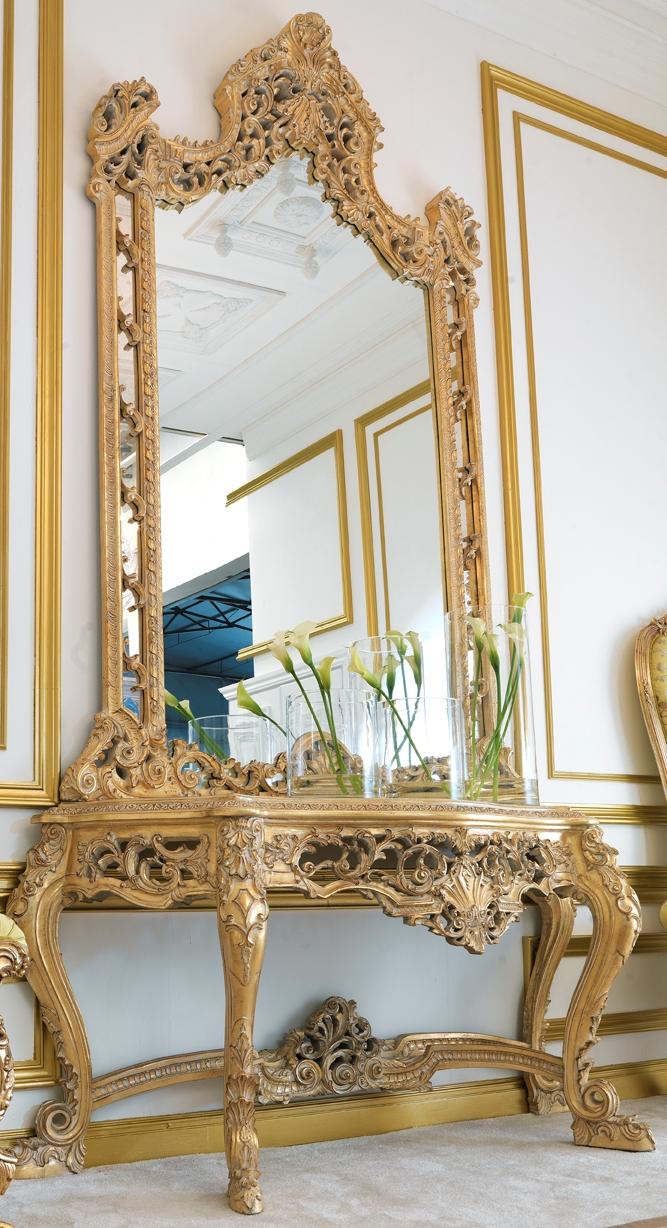 Luxe gesneden console tafel en spiegel in een elegante omlijsting.