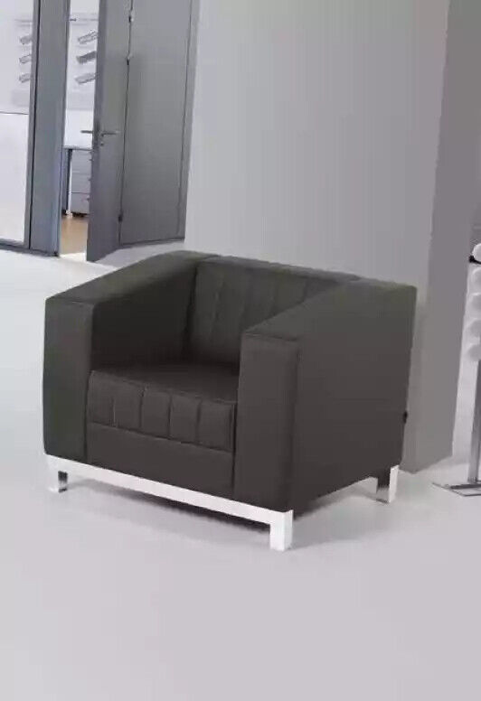Grijze fauteuil kantoormeubilair zitbekleding gestoffeerde stoel textiel werkkamer leunstoel.