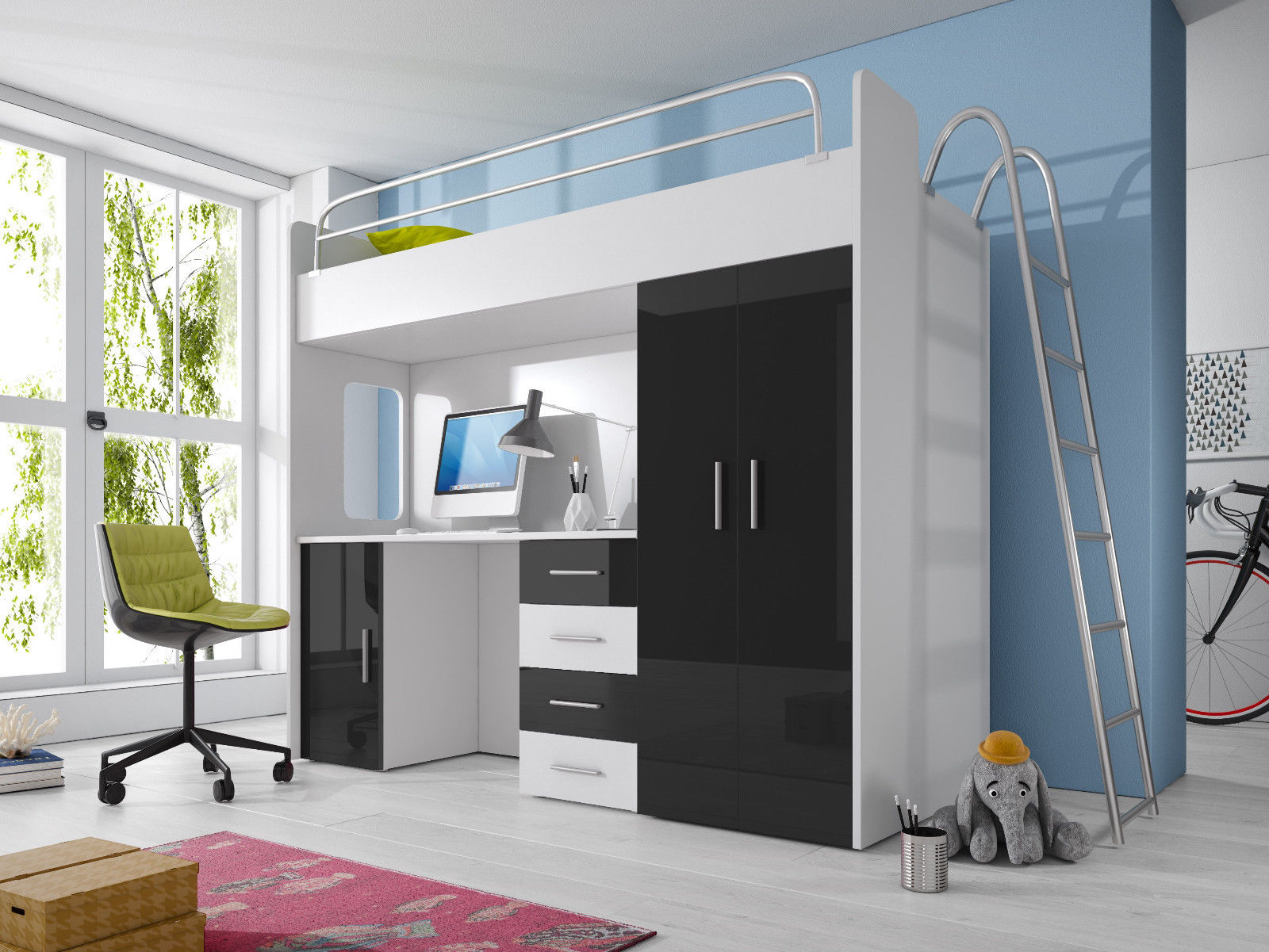 STAPELBED TWIJFELBED HOOGSLAPER BUREAU+KLEDINGKAST-RAJ 4D ZWART
