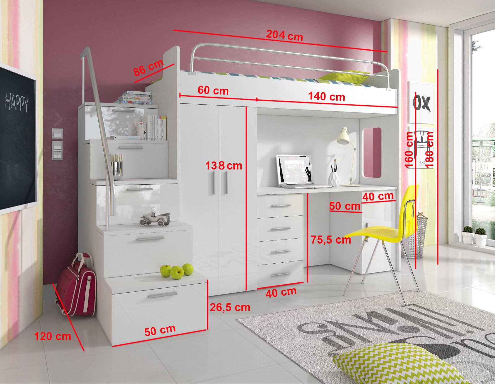 Stapelbed stapelbed tweepersoonsbed jeugdbed bedden met kast tafel RAJ4 is een veelzijdig meubelstuk dat perfect is voor kleine slaapkamers of kinderkamers. Dit stapelbed combineert een tweepersoonsbed met een praktisch bureau en een ruime kledingkast, waardoor het een functionele oplossing is voor ruimtebesparing. Gemaakt van hoogwaardig hout, biedt dit meubelstuk duurzaamheid en stijl in één handige set. Met afmetingen van ca. 204 cm breed, 180 cm hoog en 86 cm diep, is dit stapelbed geschikt voor matrassen van ca. 80 x 200 cm.