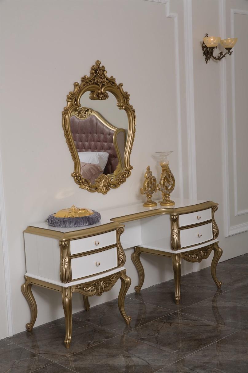 Versierd met een barokke uitstraling en een klassieke kleur zoals afgebeeld, zal deze kaptafel met spiegel console dressoir een koninklijke sfeer toevoegen aan elke ruimte. De ruime afmetingen van de tafel en de spiegel maken dit stuk ideaal voor het aanbrengen van make-up, haarstyling of het kiezen van de perfecte outfit voor elke gelegenheid. Of je nu jezelf klaarmaakt voor een speciale avond uit of gewoon geniet van een moment van zelfverwennerij, deze 2-delige set zal een luxe en praktische toevoeging zijn aan je dagelijkse routine.