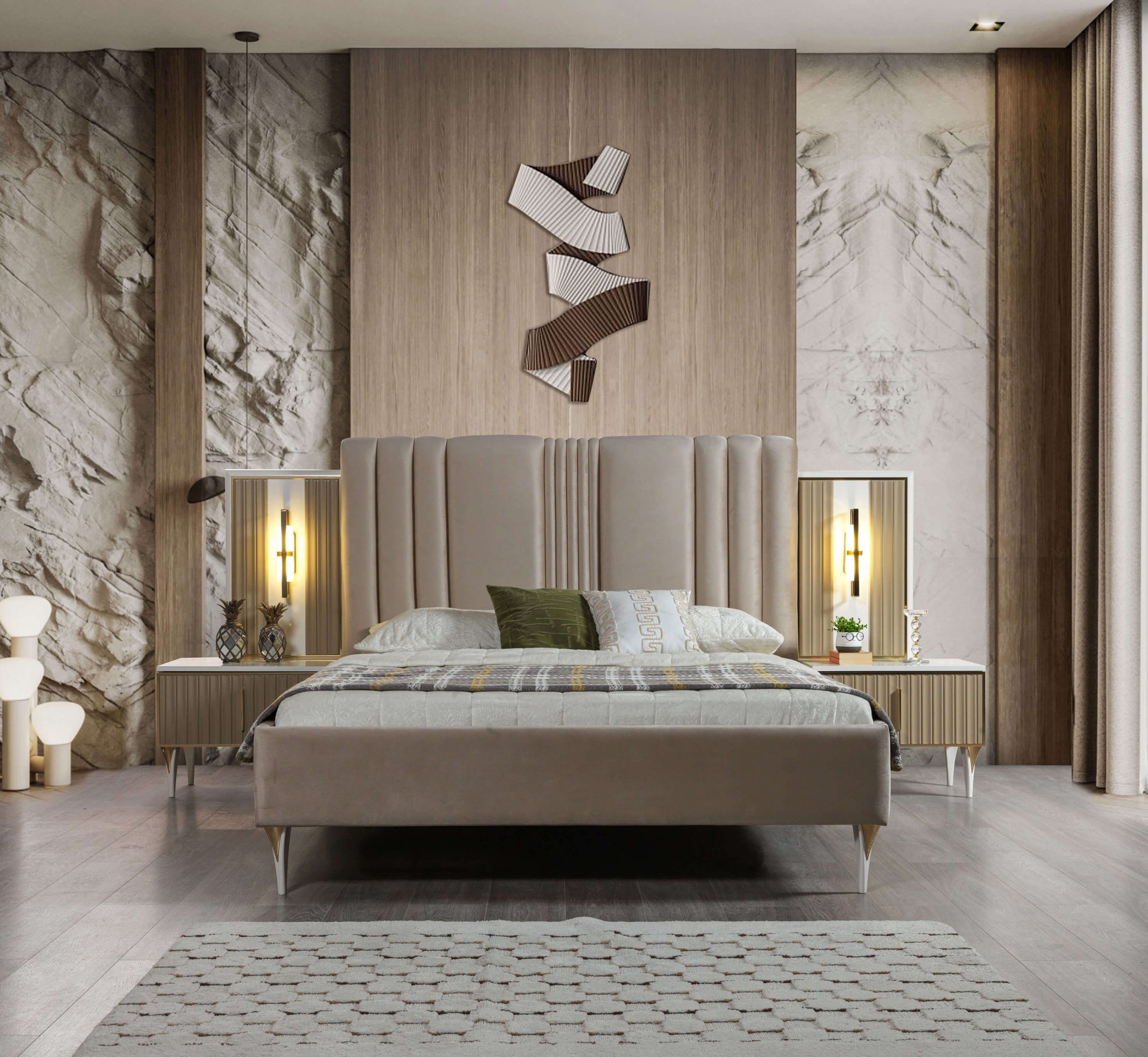 Deze elegante 3-delige meubelset, bestaande uit een verfijnd bed en bijpassende nachtkastjes, belichaamt een tijdloze luxe die elke slaapkamer transformeert. Gemaakt van hoogwaardige materialen in een subtiele beige tint, biedt deze set niet alleen esthetiek, maar ook ongeëvenaard comfort. Het strakke ontwerp en de zorgvuldige afwerking reflecteren een exclusieve levensstijl, perfect voor de veeleisende consument die verfijning waardeert. Met twintig jaar ervaring in het creëren van luxe meubels, garandeert ons merk dat iedere centimeter van deze meubelset is doordrenkt met elegantie en duurzaamheid. Kies voor deze meubelset en omarm een ambiance van exclusiviteit in uw thuis.