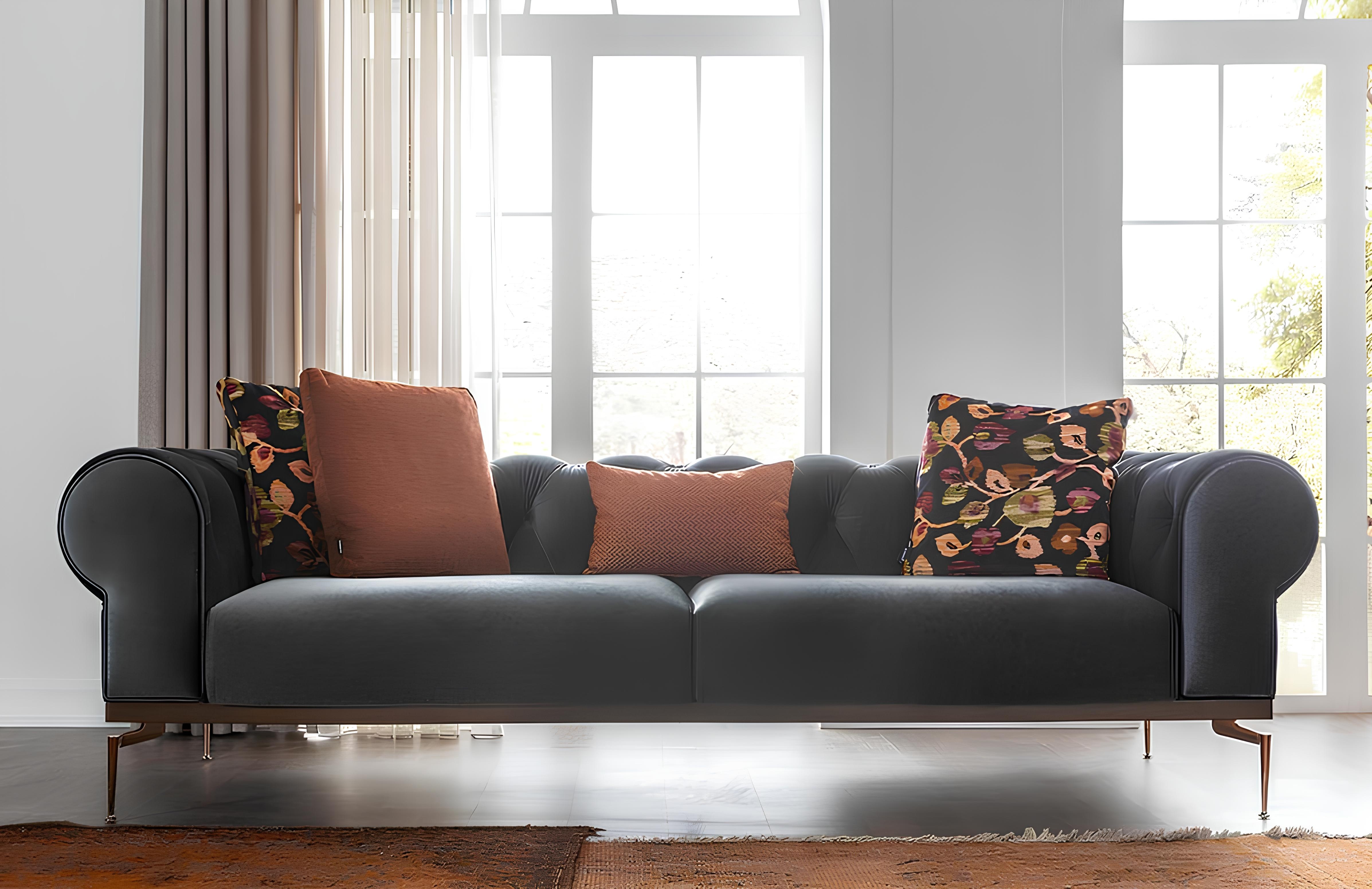 De drie-zits bank in blauw-oranje stof is een meesterwerk van verfijning en comfort. Gemaakt van hoogwaardig polyester, biedt deze bank niet alleen een uitnodigende uitstraling, maar ook uitzonderlijke duurzaamheid. De harmonieuze kleurencombinatie van diepblauw en levendig oranje creëert een statement in elke ruimte, perfect voor het verfijnen van uw interieur. Met een royale afmeting biedt deze bank ruimte voor ontspanning en samenzijn, terwijl het strakke ontwerp en de luxueuze afwerking een gevoel van exclusiviteit uitstralen. Dit meubelstuk is niet alleen een toevoeging aan uw huis, maar een weerspiegeling van een levensstijl waarin elegantie en kwaliteit centraal staan. Kies voor deze bank en transformeer uw leefruimte in een oase van luxe.