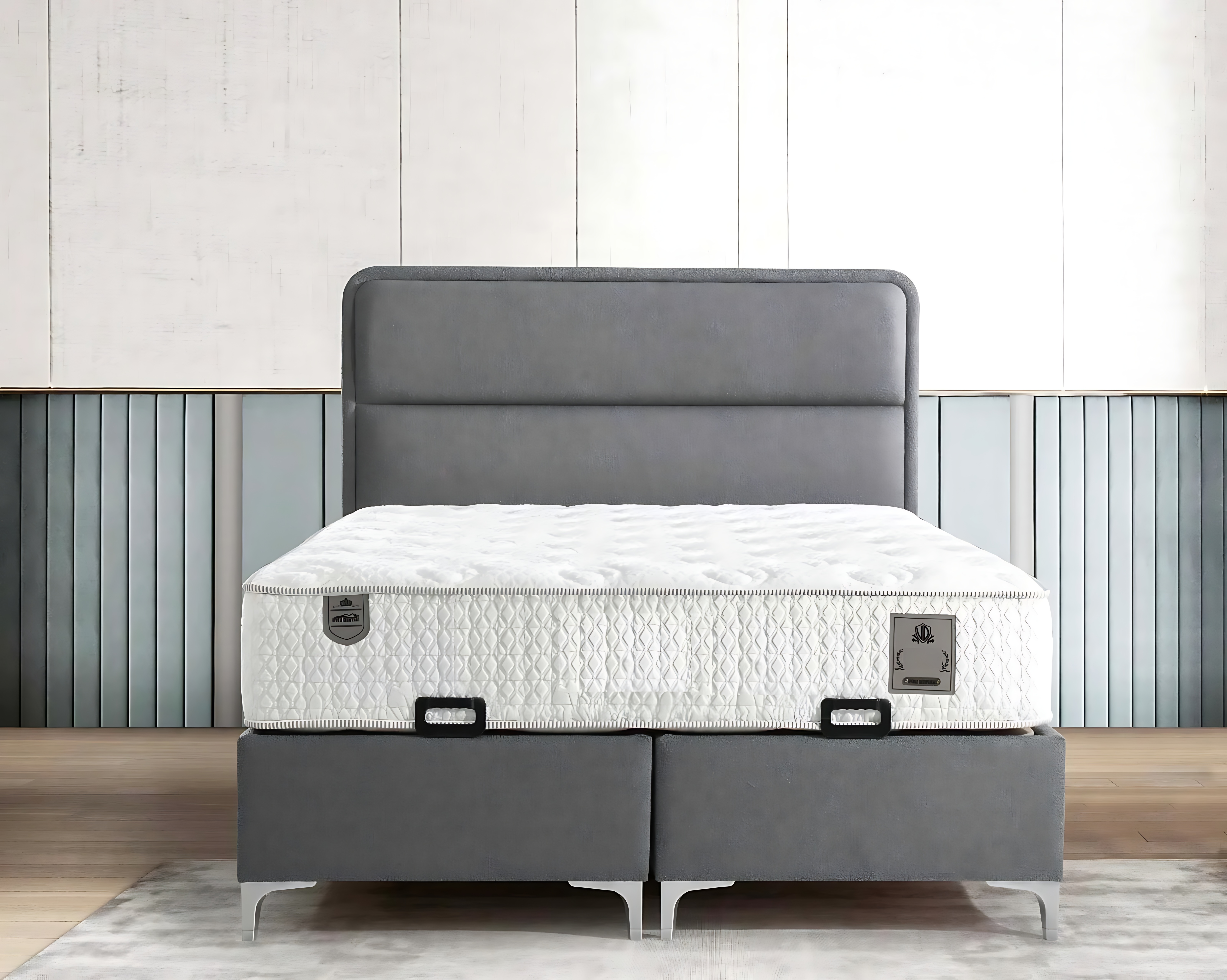 Moderne grijze bed met stoffen en houten matras