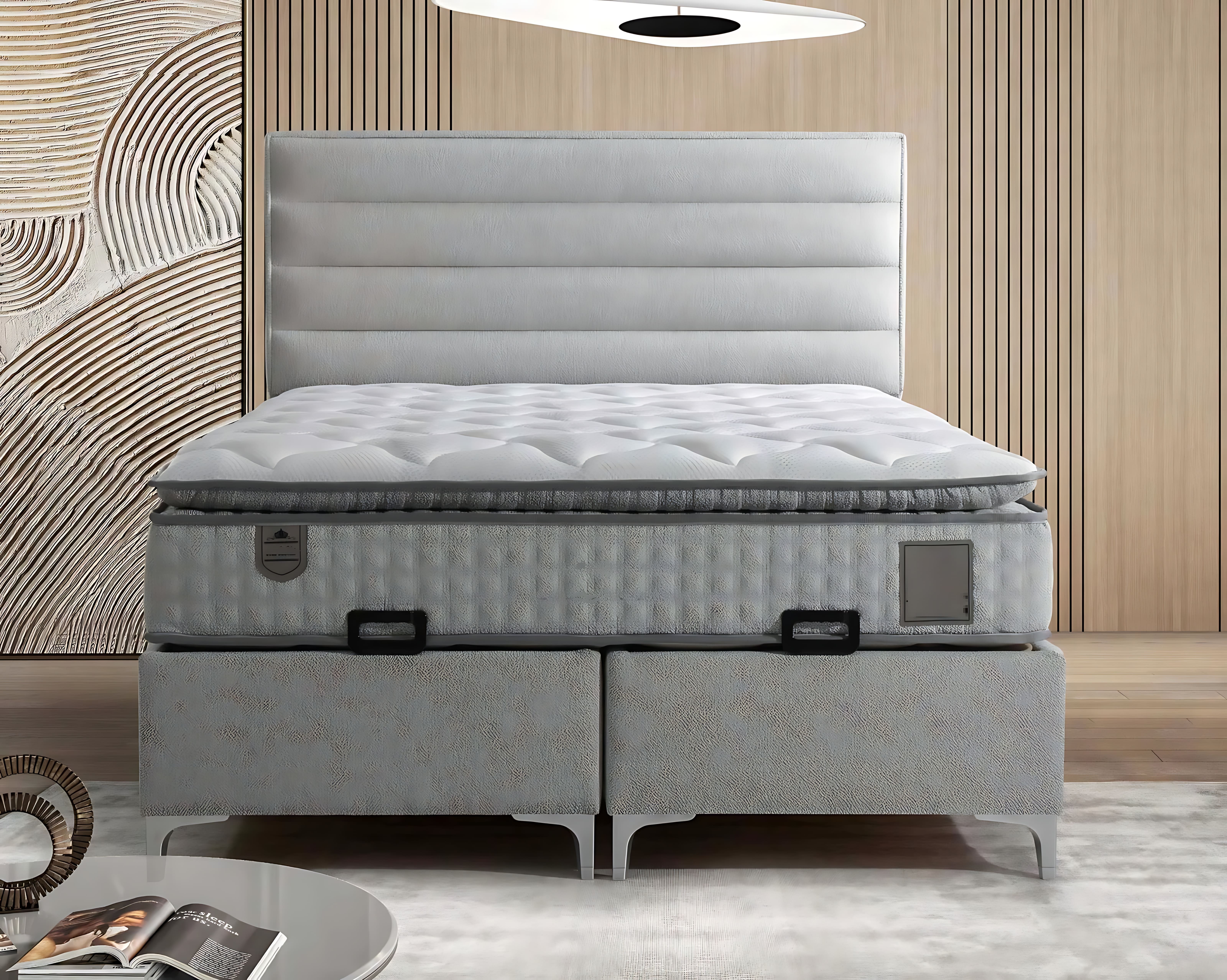 Dit moderne grijze stoffen bed met elegante matras belichaamt luxe en verfijning. Het hoogwaardige grijze hout verleent dit stuk een tijdloze uitstraling, terwijl de zorgvuldig geselecteerde stoffen een ongeëvenaard comfort bieden. De perfecte balans tussen esthetiek en functionaliteit maakt dit bed een essentieel element voor een exclusieve slaapkamer. Met zijn strakke lijnen en subtiele elegantie nodigt het uit tot ontspanning en biedt het een oase van rust. Dit bed is niet slechts een meubelstuk; het is een statement van een verfijnde levensstijl. Kies voor een inrichting die de essentie van luxe vastlegt en investeer in een meesterwerk dat jarenlang bewondering zal oogsten.
