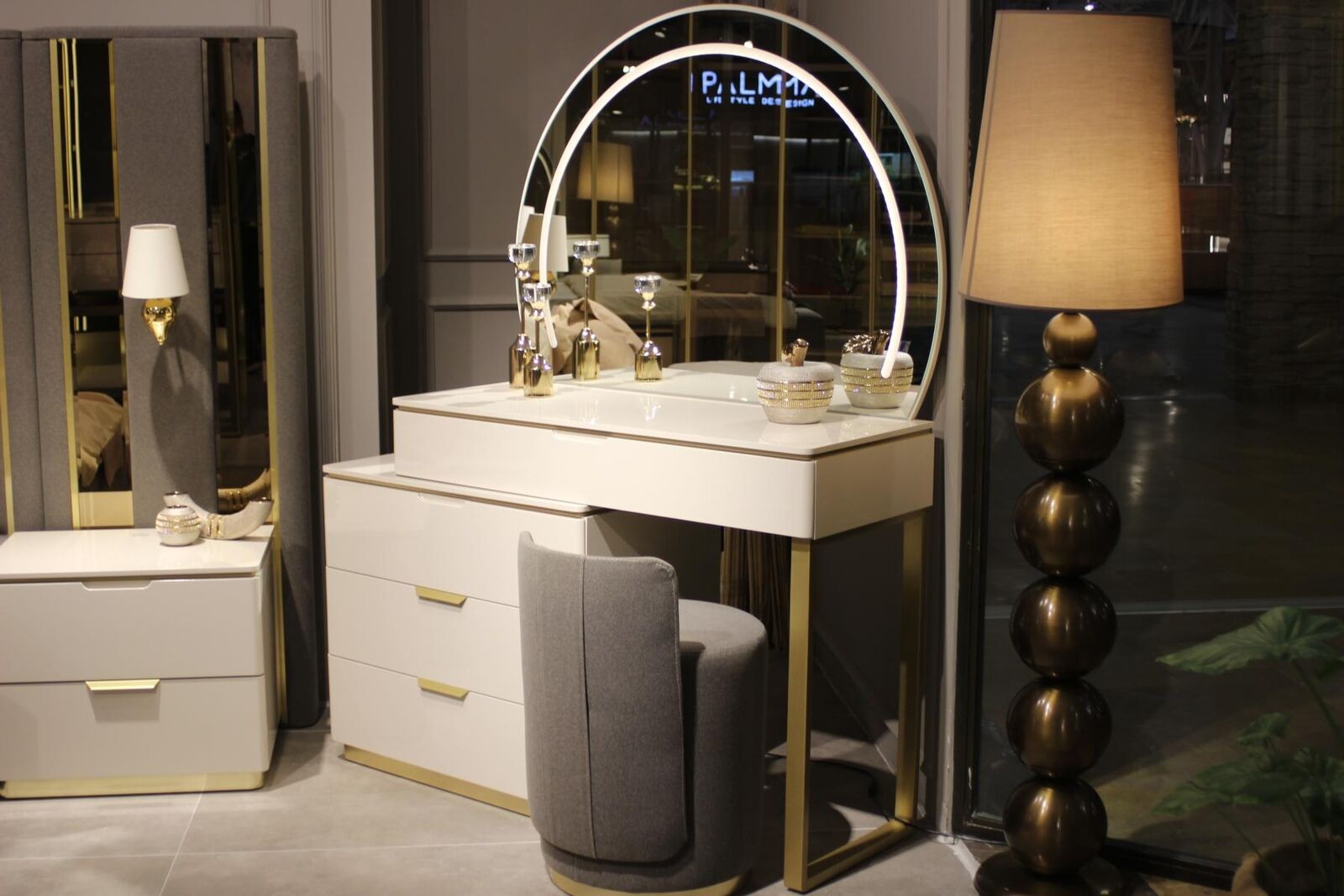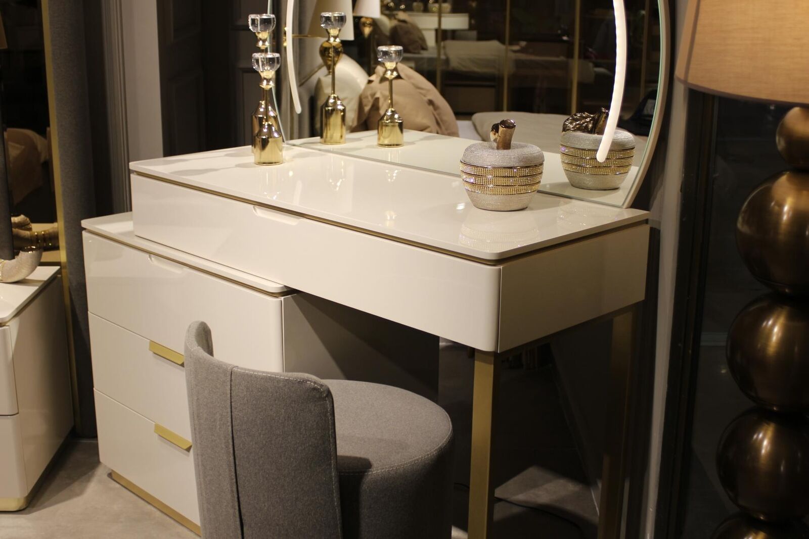Voor een complete en verfijnde slaapkamerinrichting is deze kaptafel met spiegel ideaal. Het ruime tafelblad biedt voldoende ruimte voor al je make-up en accessoires, terwijl de spiegel je helpt bij het aanbrengen van een perfecte look. De hoogwaardige materialen zorgen voor een lange levensduur, en het tijdloze ontwerp past moeiteloos bij verschillende decoratiestijlen. De kaptafel kan zowel functioneel als decoratief zijn, waardoor het een onmisbaar meubelstuk is voor elke moderne slaapkamer. Creëer een persoonlijke beautyhoek met deze kaptafel en spiegel en geniet van een luxueuze ervaring in je eigen huis.