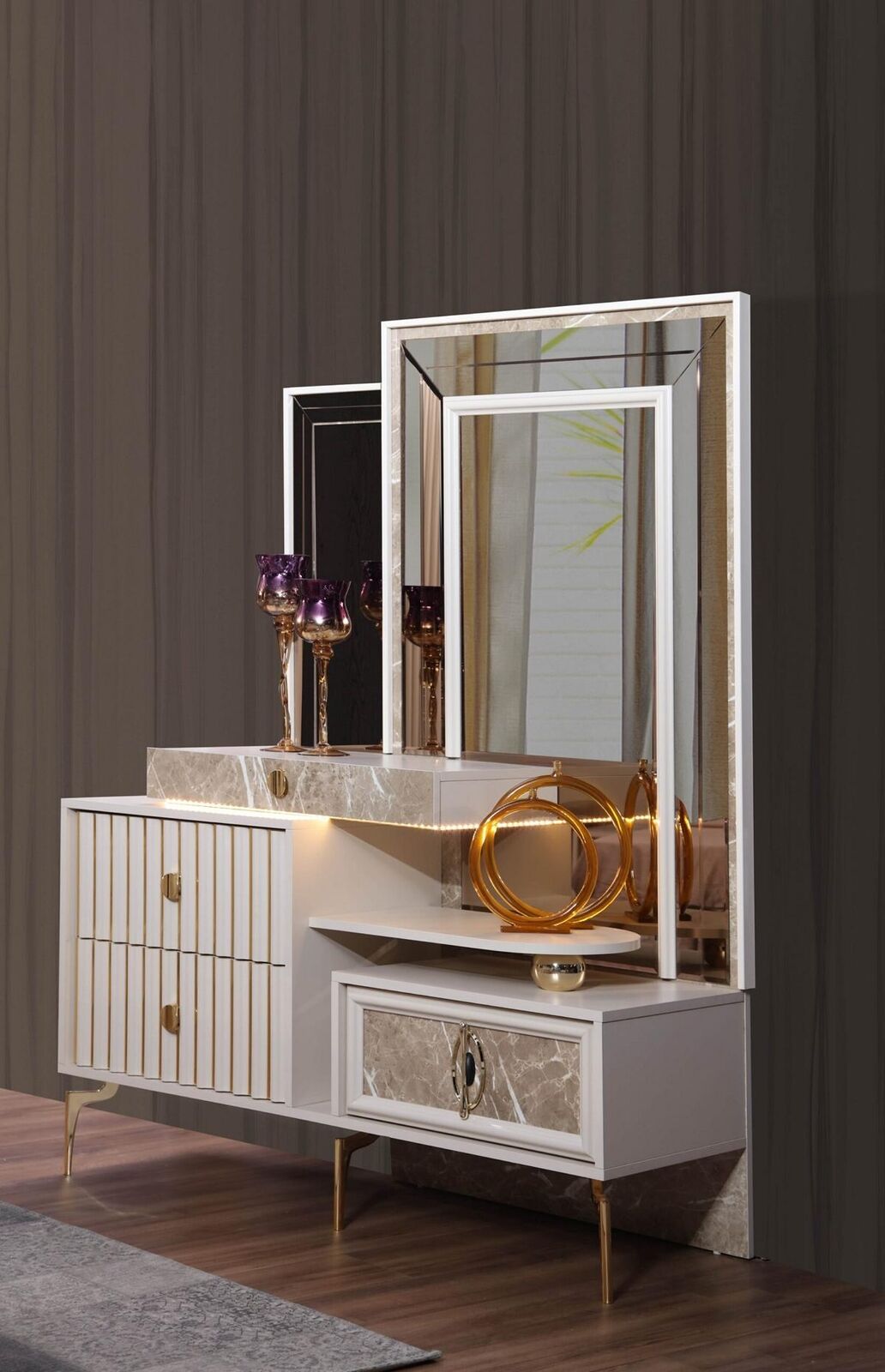 Met de moderne compleet slaapkamerset Designer bed 2x nachtkastjes 5-delig creëer je moeiteloos een luxueuze en georganiseerde slaapruimte. De ruime kledingkast biedt voldoende opbergruimte voor kleding en accessoires, terwijl de make-up tafel met spiegel als een handige beautystation dient. Plaats de elegant ontworpen bed en nachtkastjes in je slaapkamer voor een moderne uitstraling en geniet van het comfort en de functionaliteit die deze set te bieden heeft. Ervaar het ultieme gemak en de luxe van deze slaapkamerset en geef je slaapkamer een make-over met dit prachtige ensemble.