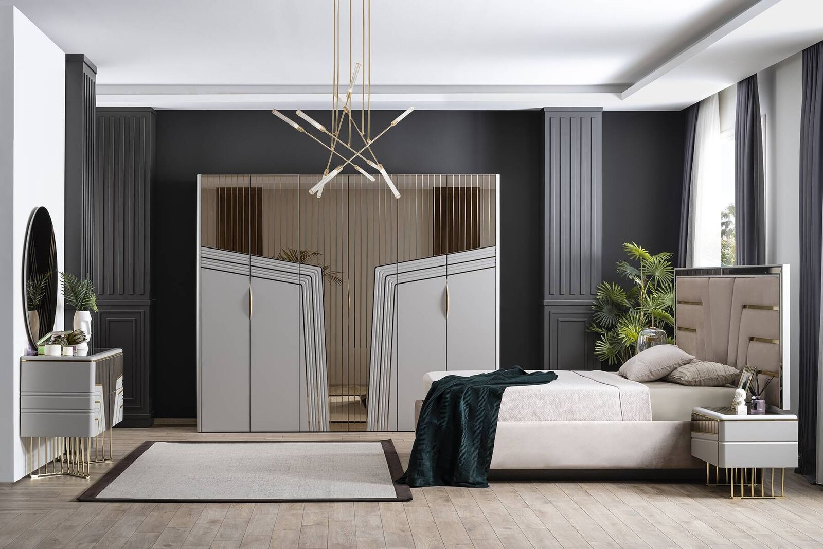Met de 2 bijpassende nachtkastjes heeft u ruimte voor het opbergen van essentiële items binnen handbereik. De kledingkast biedt voldoende opbergruimte voor kleding en accessoires, terwijl de commode extra praktische opbergruimte biedt. De ingesloten spiegel voegt een vleugje elegantie toe en is perfect voor het bekijken van uw outfit voor de dag. Deze moderne slaapkamer set is ideaal voor wie op zoek is naar een luxueuze en functionele inrichting voor de slaapkamer.