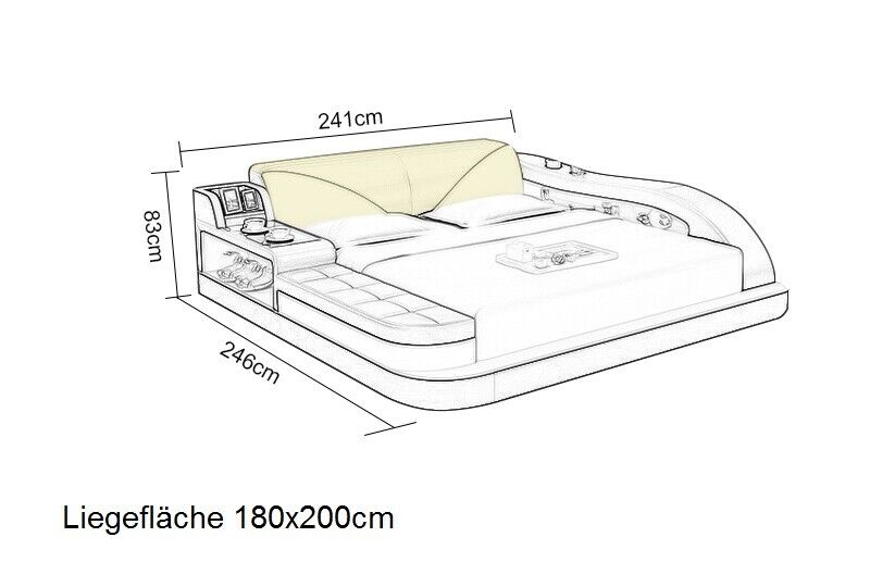 Multifunctioneel bed Tweepersoonsbed Modern bedframe Bedden 180x200cm is een luxueus en modern bedframe dat perfect is voor het creëren van een stijlvolle slaapkamer. Met een matrasoppervlakte van ongeveer 180 x 200 cm en een totale bedmaat van circa 241 x 246 x 83 cm, biedt dit bed voldoende ruimte en comfort voor een goede nachtrust. Het bed is voorzien van een lattenbodem voor extra ondersteuning en is gemaakt van hoogwaardig leer, met een binnenframe van echt hout voor duurzaamheid en stevigheid. De gevoerde zitting en lade compartimenten zorgen voor zowel comfort als gemak, terwijl de LED ondergrondverlichting een vleugje elegantie toevoegt aan de slaapkamer.