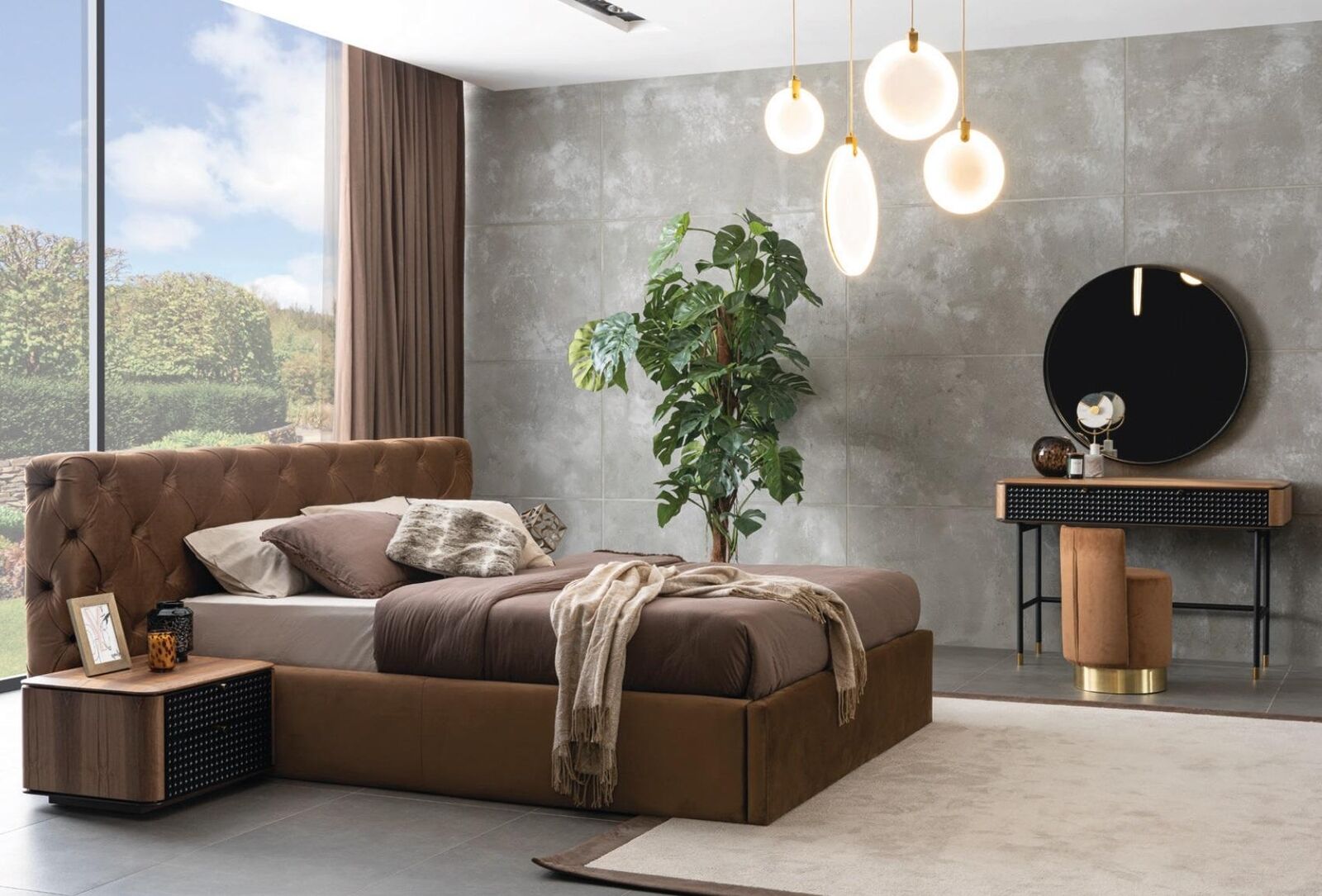Deze 6-delige slaapkamer set is ideaal voor diegenen die op zoek zijn naar een complete en harmonieuze inrichting. Het houten frame en het gebruik van textiel geven de meubelstukken een duurzame en luxe uitstraling. Met de Make-up tafel en Spiegel creëer je een eigen beautyhoekje, terwijl het comfortabele bed en Hocker een gezellige sfeer toevoegen aan de slaapkamer. Of je nu geniet van een ontspannen avond in bed of je klaarmaakt voor een nieuwe dag, deze slaapkamer set voorziet in al jouw behoeften op het gebied van comfort, functionaliteit en design.