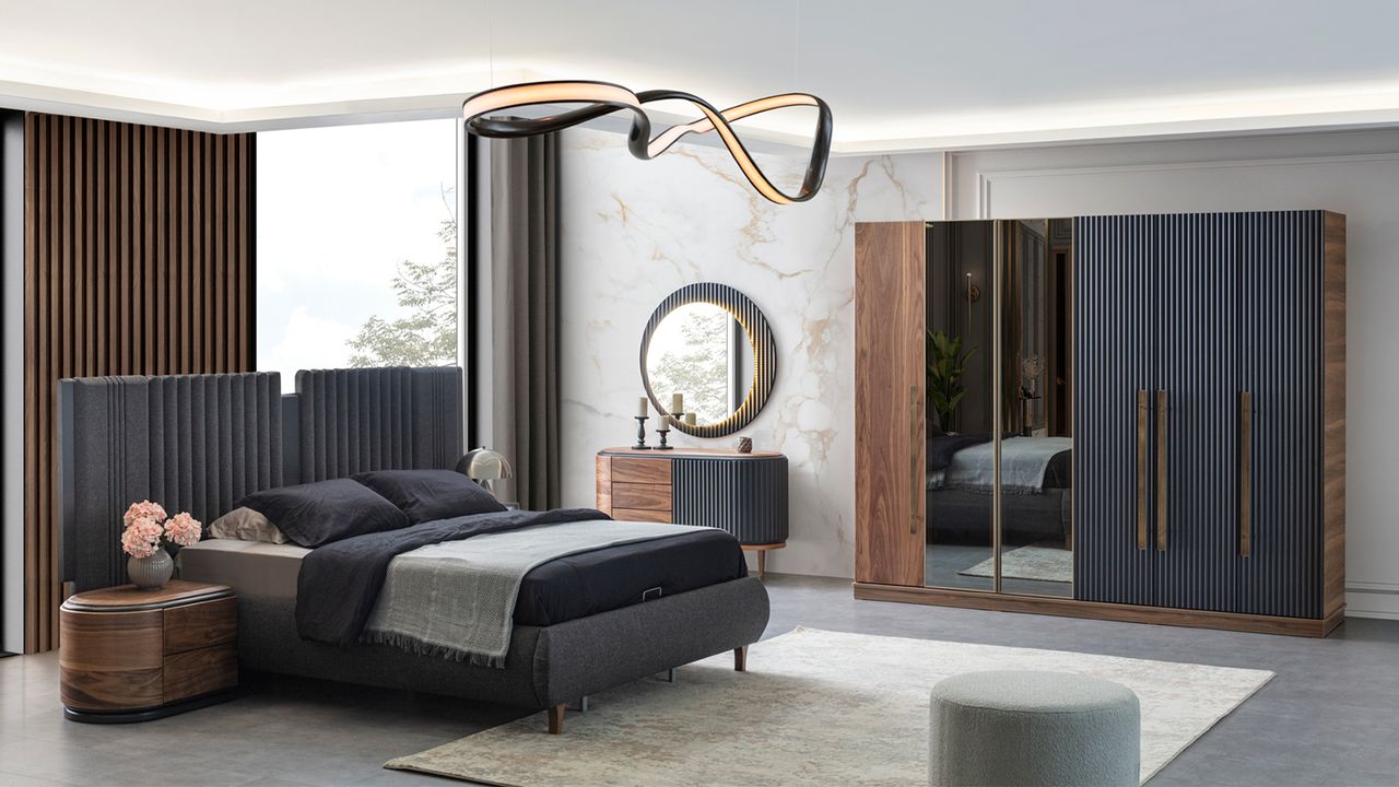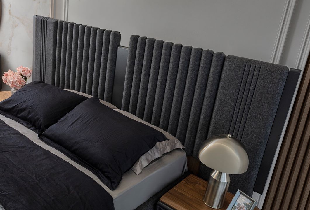 Zwart-beige slaapkamer set, ontwerper tweepersoonsbed, 2 nachtkastjes.