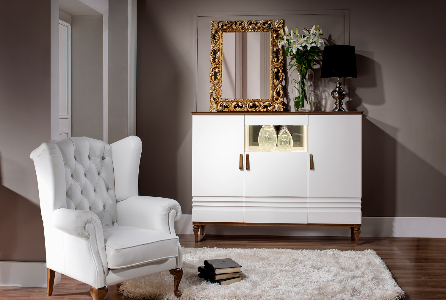 Rückwand & Einlegeböden: MDF (Mitteldichte Holzfaserplatte), furniert & lackiert